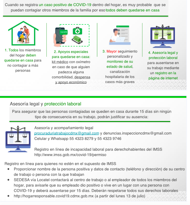 Finalmente se dará asesoría legal y protección laboral para que las personas enfermas puedan quedarse en casa sin algún tipo de consecuencia en su trabajo. Para los afiliados al IMSS se podrá acceder al registro de su incapacidad laboral en línea a través de este sitio web, mientras que para los no son derechohabientes, se tendrán que dar información de contacto sobre la empresa donde trabaja o de su empleador para que la Secretaría de Salud se comunique con ellos.