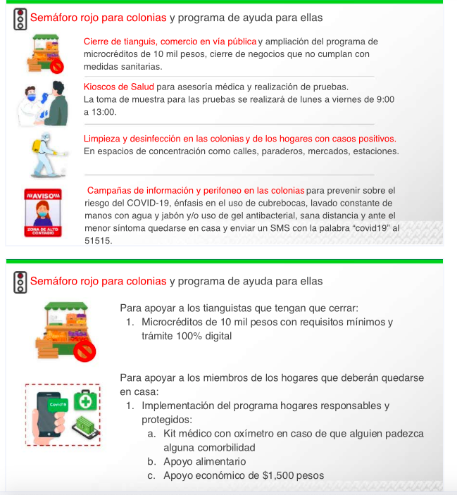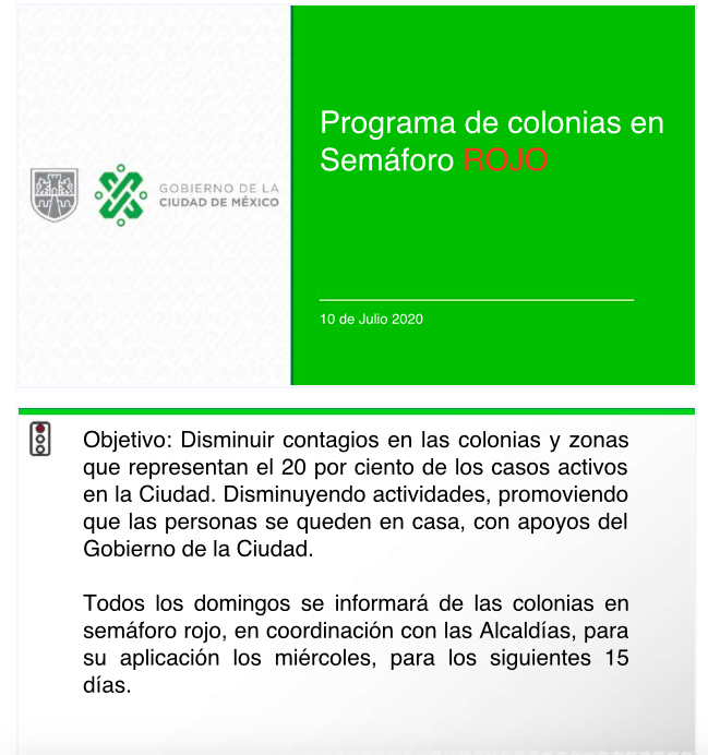 El segundo programa consiste en un semáforo local dentro de CDMX, que se enfocará en las colonias más afectadas; cada domingo se informará qué colonias estarán en semáforo rojo durante 15 días, y tendrán que suspender algunas actividades.
