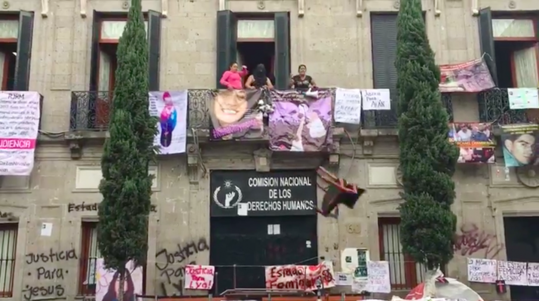 Desde la semana pasada colectivos feministas mantienen la toma del edificio sede de la Comisión Nacional de Derechos Humanos (CNDH), en el Centro Histórico de Ciudad de México, como reclamo para acciones efectivas contra la violencia de género.