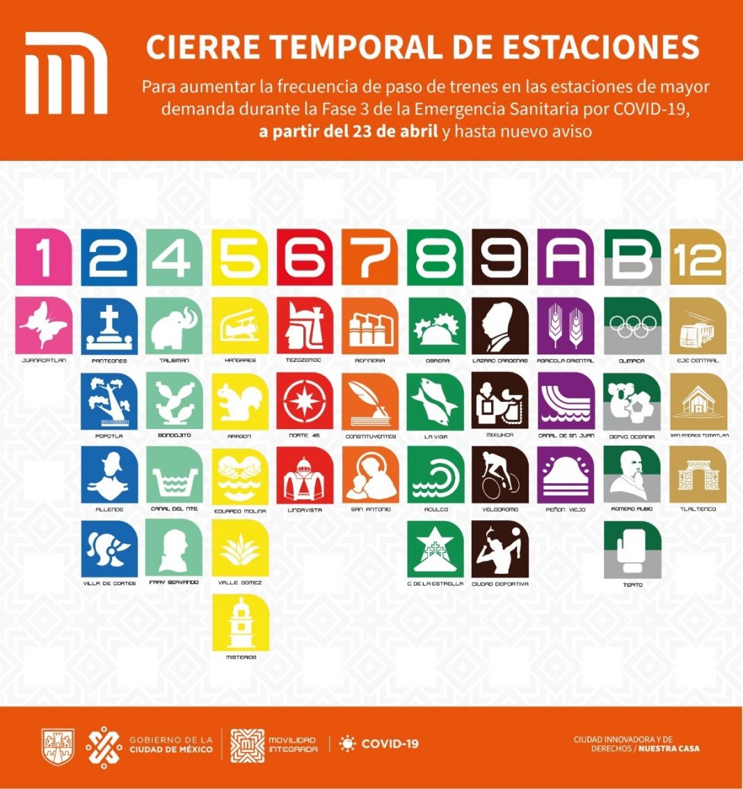“A partir del 23 de abril y hasta nuevo aviso, habrá cierre temporal del 20 por ciento de las estaciones con menor demanda en los sistemas de transporte que conforman la Red de Movilidad Integrada(MI); esto con la finalidad de aumentar la frecuencia de paso en las estaciones de mayor demanda y disminuir las aglomeraciones”, informó el Gobierno capitalino.