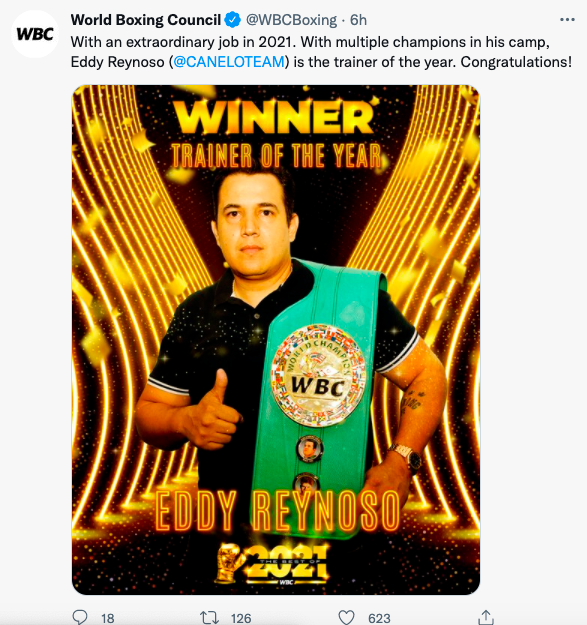 Saúl ‘Canelo’ Álvarez y su entrenador Eddy Reynoso han sido reconocidos por el Consejo Mundial de Boxeo (CMB) como mejor boxeador y mejor entrenador del año.