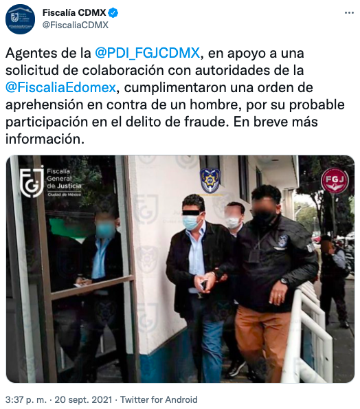 La Fiscalía de CDMX informó de la detención del empresario, en colaboración con autoridades del Estado de México.