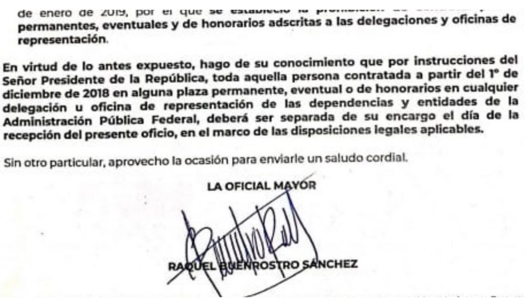 Por decreto presidencial, «toda persona contratada a partir del 1 de diciembre de 2018, en alguna plaza permanente, eventual o de honorarios, en cualquier delegación u oficina de las dependencias y entidades de la Administración Pública Federal, será despedida».