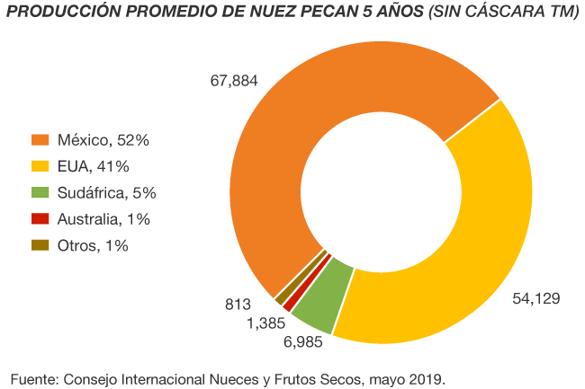 En los últimos 5 ciclos México se ha mantenido como el principal productor mundial de nuez pecana con participación de 52% en la oferta global, seguido de EUA con 41%, Sudáfrica con 5%, Australia 1%, otros 1 por ciento.