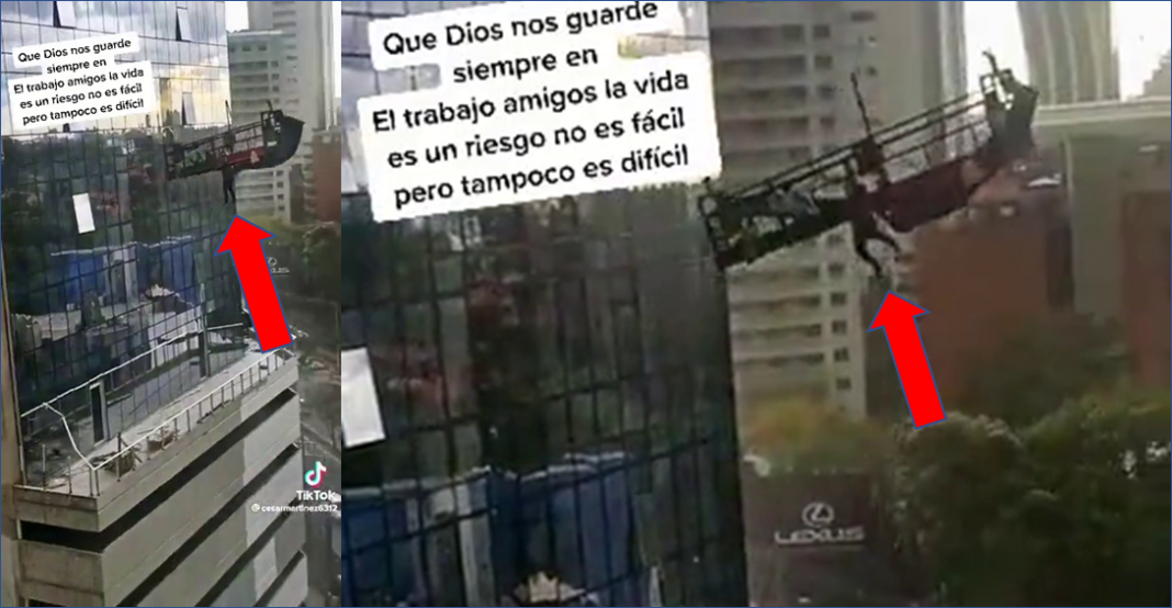 En el video en cuestión se ve a un trabajador, limpiador de edificios literalmente colgando del andamio, aferrándose a la vida para no caer al vacío; en el mismo material se ve como el andamio es fuertemente azotado por el terrible viento, pero ojo, en el mismo andamio se ve a otro hombre acostado para no salir volando.