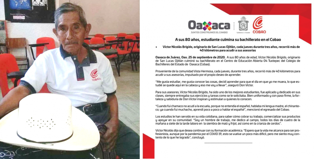 «Me gusta estudiar, me gusta conocer las cosas, decidí aprender para que el día en que yo muera, lo que estudié se quede en mi cabeza, y eso me voy a llevar», dice Don Víctor, acabado de graduarse de preparatoria, gracias al sistema de educación abierta en el Colegio de Bachilleres del Estado de Oaxaca, en la región de la Cuenca del Papalopan.
