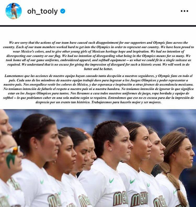 Agregaron: «Nos enorgullece vestir los colores de México y dar esperanza e inspiración para otras jóvenes de ascendencia mexicana. No teníamos la intención de faltarle el respeto a nuestro país ni a nuestra bandera. No teníamos intención de ignorar lo que significa estar en los Juegos Olímpicos para tantos. Nos llevamos a casa todos nuestros uniformes de juego, ropa bordada y equipo de softbol -lo que podía caber en una maleta-. Entendemos que eso no es excusa para dar la impresión de desprecio por un evento tan histórico. Trabajaremos para hacerlo mejor y ser mejores».