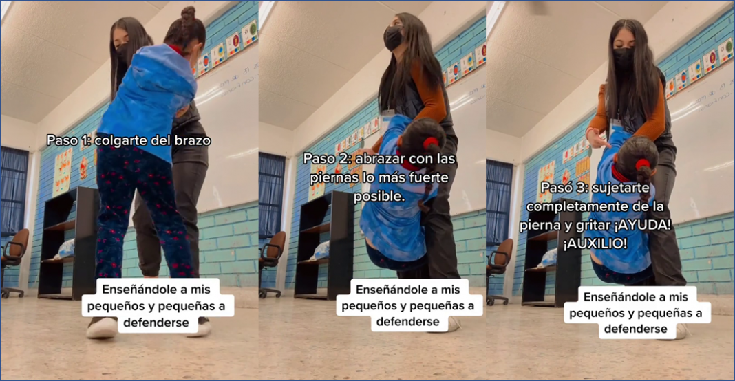 En el video se ve como toma a una de sus alumnas mientra le dice a los demás: «imagínate que vas caminando y alguien te agarra, ¿qué haces?…El primer paso es ‘colgarse del brazo’ de la persona que los está atacando, después de ello les dice que deben cruzar sus dos piernas alrededor de la pierna del atacante y poner todas sus fuerzas en ello», se escucha decir a la profesora mientras realiza los movimientos.