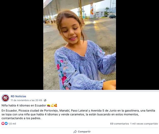 «Estamos realmente impactadas mi mamá y yo, porque en una gasolinera aquí en Ecuador, nos encontramos a una niña que habla perfecto Francés, mi mamá que es nacida en Francia, pudo reconocer este acento», dice la joven que grabó el video.