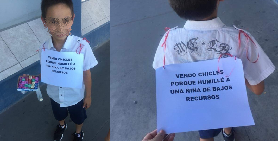 «Vendo chicles porque humillé a una niña de bajos recursos», y es que resulta que el menor, en compañía de otros niños, humilló a una niña de bajos recursos, quien se gana la vida junto a su familia recolectando botes en la basura.