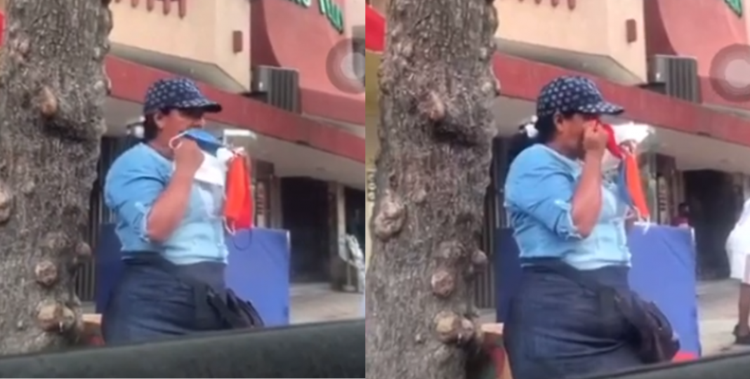 Comenzó a circular en redes sociales un video en el que «cacharon» a una vendedora ambulante usando un cubrebocas, pero no para cuidarse del coronavirus, no señor, ¡sino para limpiarse los mocos! Por si eso fuera poco, luego los vende al público, esto según testigos, quienes también afirman que la mujer está acostumbrada hacer eso.