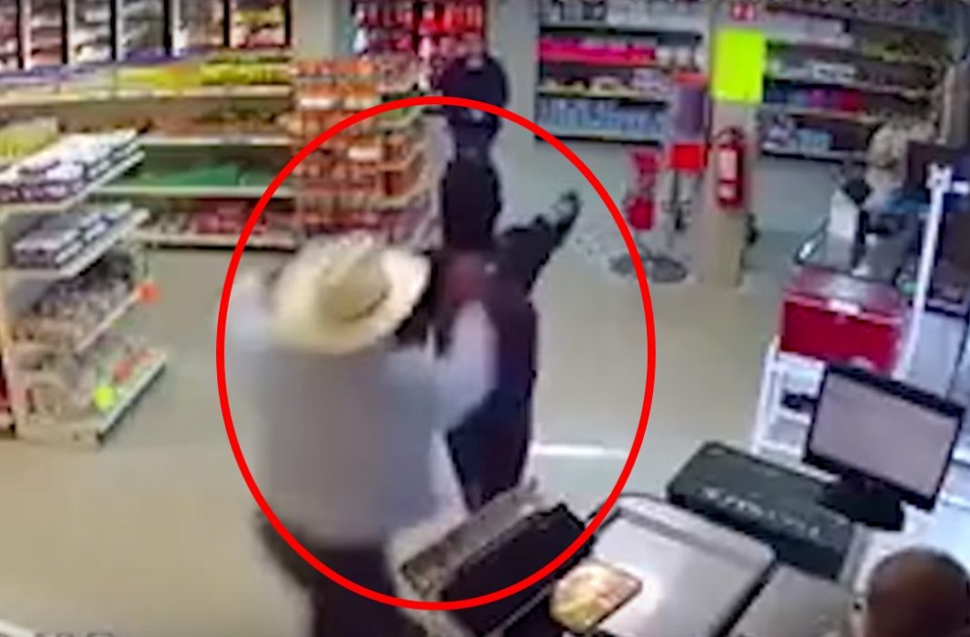 En el video se ve como en un momento de distracción del caco, el cliente con sombrero, se avalanza al asaltante para desarmarlo y luego someterlo por un instante, pero el tipo logró zafarse, para antes de intentar huir por la puerta principal, fuera finalmente capturado por el cliente y dos empleados de la carnicería.