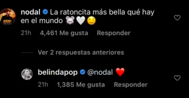 En particular con una de las historias de Instagram de Nodal, en donde compartió una imagen en la que aparece abrazando a Belinda con un letrero de “Te amo”.