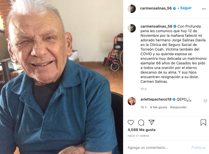 “Con Profunda pena les comunico que hoy 12 de Noviembre por la mañana falleció mi adorado hermano Jorge Salinas Davila en la Clínica del Seguro Social de Torreón Coah. Víctima también del COVID y su querida esposa se encuentra muy delicada”, informó la actriz y productora Carmen Salinas.