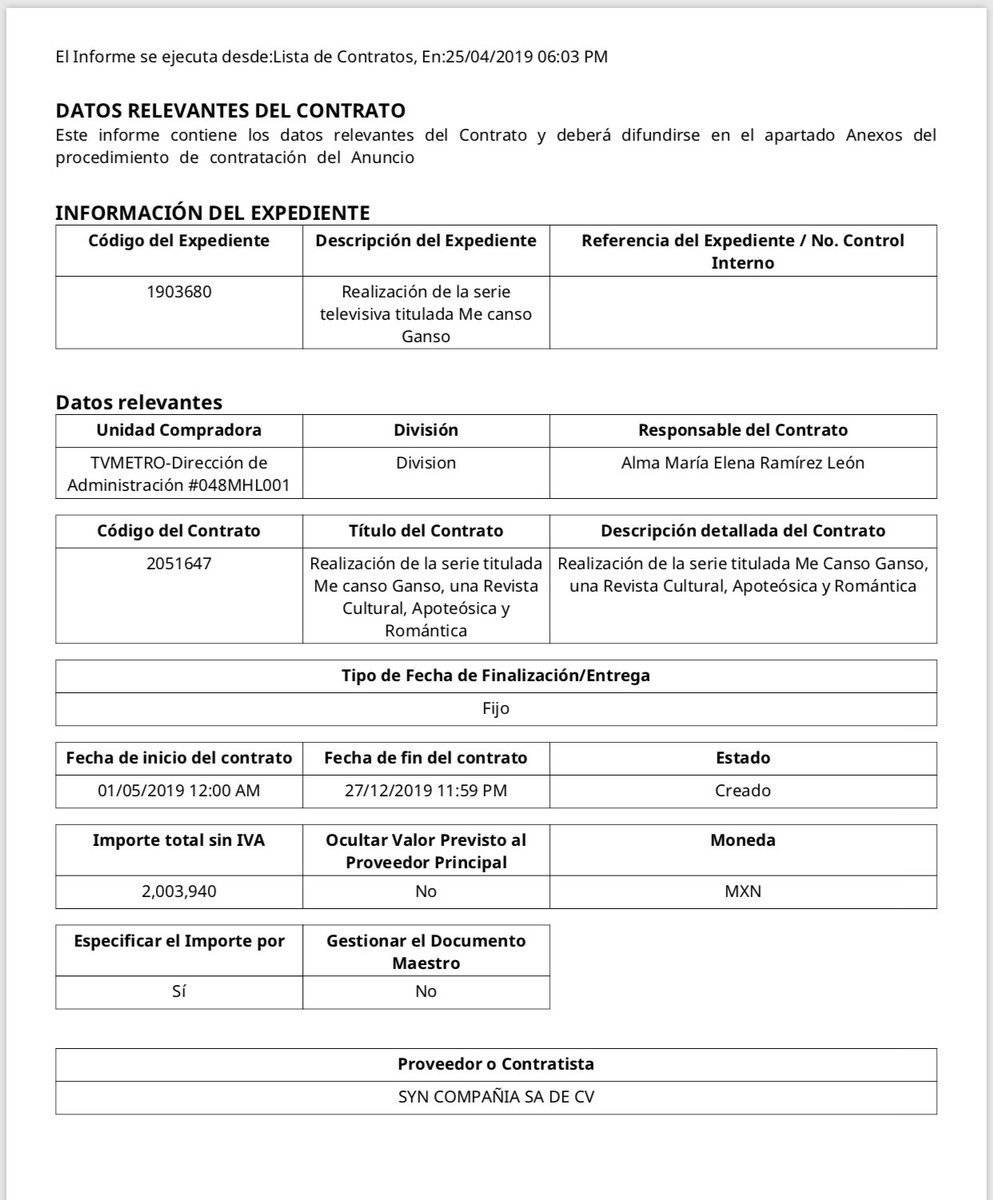 La misma será realizada por TV-METRO Dirección de Administración, razón social de Canal 22 y la responsable del contrato es Alma María Elena Ramírez León.