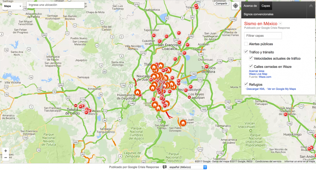 El Mapa de Crisis del Sismo en México incluye información de alertas públicas, así como de albergues, centros de acopio, calles cerradas y velocidad de las vialidades.
