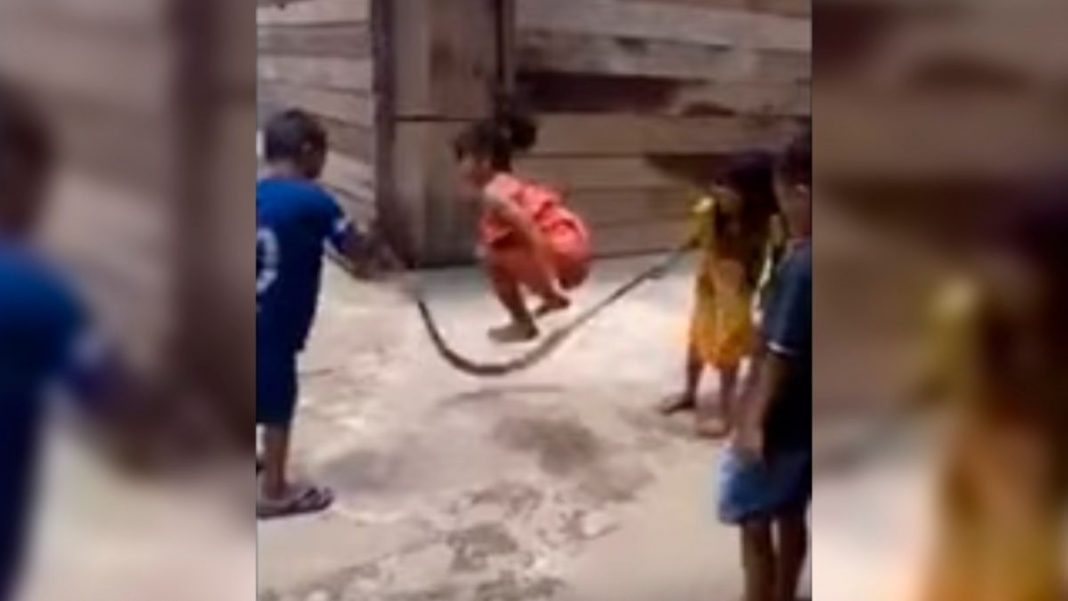 En las imágenes, que ya tienen cientos de reproducciones en YouTube, se observa a dos niños balanceando el largo cadáver de la serpiente de un extremo a otro, mientras una niña salta sobre el reptil muerto mientras canta, como si se tratara de una cuerda.