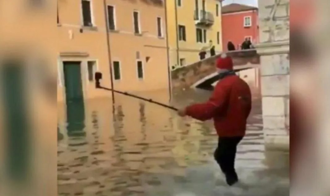 En redes sociales se ha hecho viral un video que muestra el momento en que un hombre que cae en un canal ubicado en una zona inundada de Venecia, Italia.