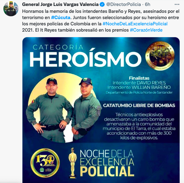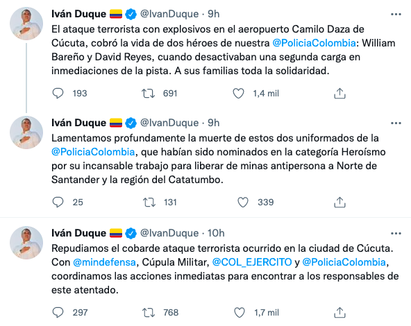 «Repudiamos el cobarde ataque terrorista ocurrido en la ciudad de Cúcuta (…) coordinamos las acciones inmediatas para encontrar a los responsables de este atentado», escribió el presidente Iván Duque, por medio de su cuenta de Twitter.