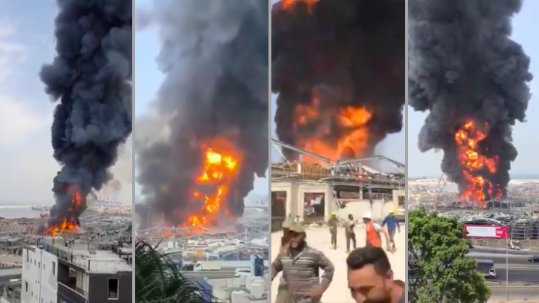 Imágenes de televisión mostraron a los bomberos tratando de apagar el incendio en un área rodeada por los restos destrozados de los almacenes que fueron destruidos por la explosión el mes pasado.
