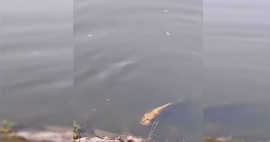 En las imágenes compartidas se muestra al pez nadar en el lago; al acercarse a la orilla del mismo comienza a comer algo por lo que su parecido con los humanos se hace más similar.