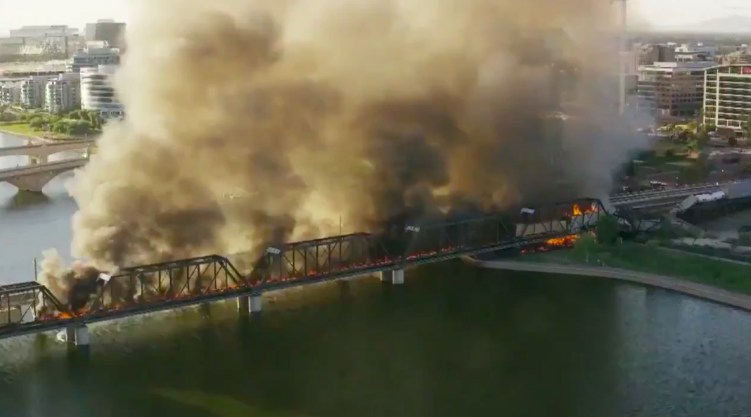 Medios locales difundieron imágenes de los vagones atascados sobre la estructura metálica que atraviesa el lago Tempe Tow, cercano a la ciudad de Phoenix (capital de Arizona), de los que se desprendían gruesas columnas de humo.