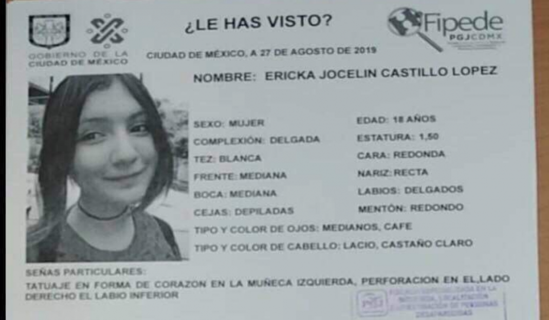 Familiares y compañeros de clase han denunciado la desaparición de Ericka Joselyn Castillo López, de 18 años, quien fue vista por última vez este lunes a las 17:00 horas en la inmediaciones de la estación Guerrero de la Línea 3 del metro de la Ciudad de México, misma en la que está Deportivo 18 de marzo, ubicada cerca de la Prepa 9.