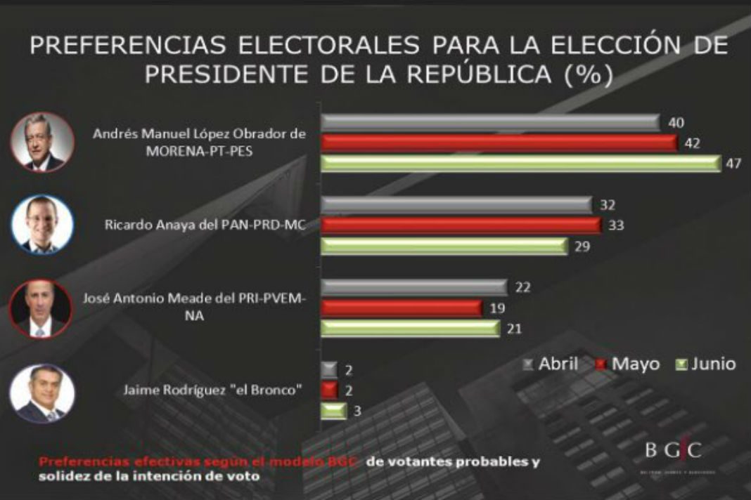 El candidato presidencial por la coalición, “Juntos Haremos Historia”, Andrés Manuel López Obrador, cuenta con el 47 por ciento de la intención de voto, según encuesta publicada por BGC, Ulises Beltrán y Asocs, S.C, realizada desde el 31 de mayo al 4 de junio.