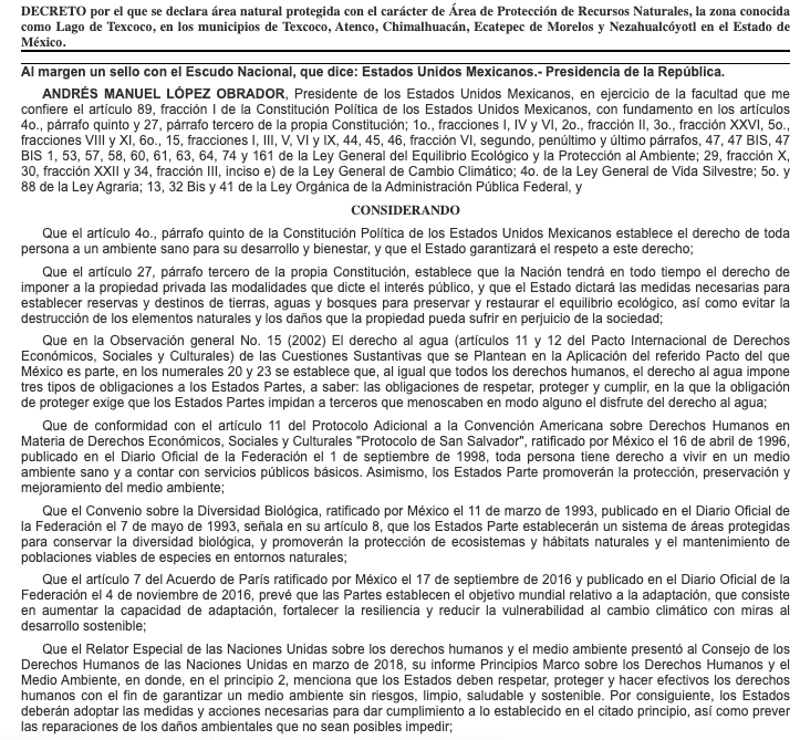 «Se declara área natural protegida, con carácter de Área de Protección de Recursos Naturales, la zona conocida como Lago de Texcoco (…), se ubica en los municipios de Atenco, Texcoco, Chimalhuacán, Nezahualcóyotl y Ecatepec de Morelos en el Estado de México, con una superficie de 14,000-33-48,53 hectáreas», se lee en el documento.