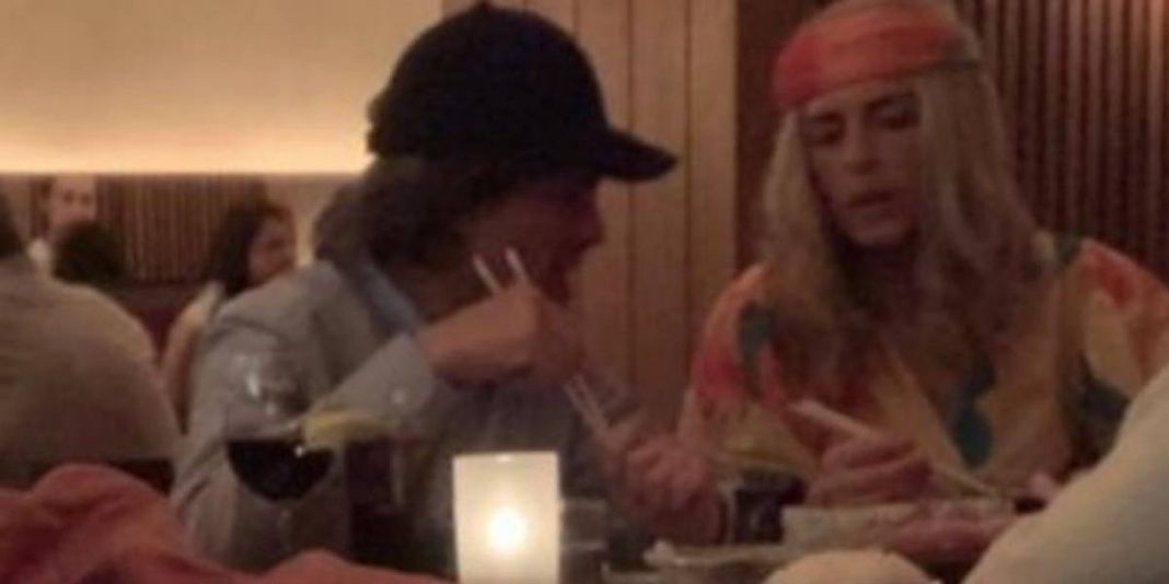 En las imágenes que compartió Lozano desde su cuenta oficial se observa una pareja en un restaurante de comida oriental en Nueva York, él luce una gorra negra y el cabello largo y ella con una banda color rosa en la cabeza y una peluca rubia, ambos con palillos chinos.