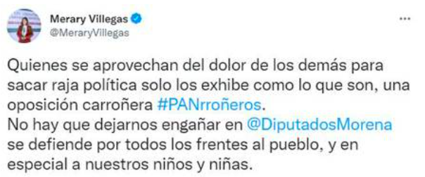 «Quienes se aprovechan del dolor de los demás para sacar raja política solo los exhibe como lo que son, una oposición carroñera PANrroñeros. No hay que dejarnos engañar, en Morena se defiende por todos los frentes al pueblo, y en especial a nuestros niños y niñas», fue la respuesta de Villegas a la polémica.