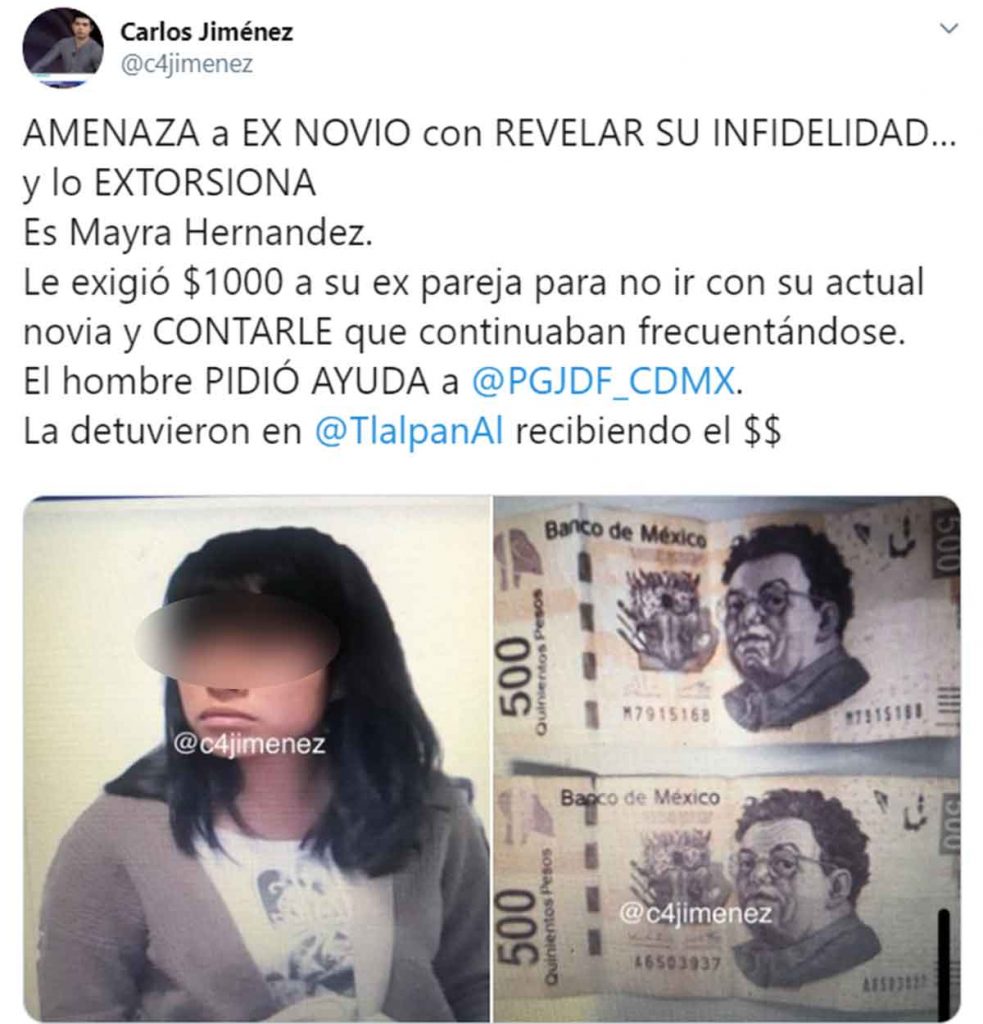 De acuerdo con el reporte, Mayra “N” exigió mil pesos a su expareja para no revelar que seguían frecuentándose.