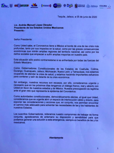 Una misiva fechada al 5 de junio y firmada por los gobernadores de Jalisco, Guanajuato, Durango, Tamaulipas, Nuevo León, Coahuila, Michoacán y Colima solicita al presidente Andrés Manuel López Obrador una audiencia para exponer las necesidades de sus entidades frente a la pandemia de COVID-19.