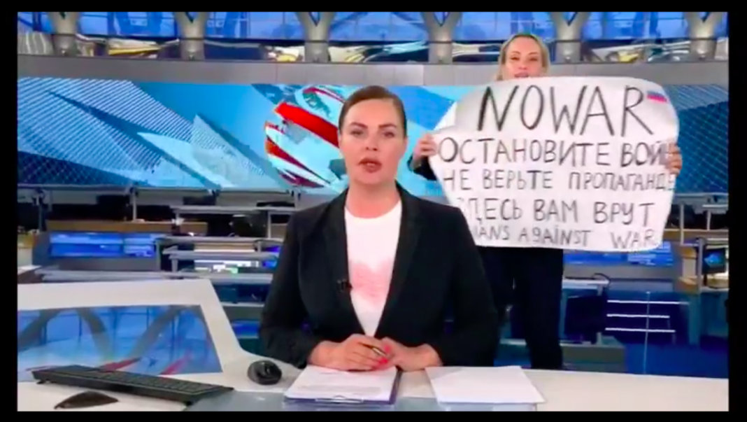 Durante la emisión de uno de los principales programas de noticias de la televisión estatal rusa se registró la peculiar irrupción de una manifestante contra la guerra, en directo en el estudio.
