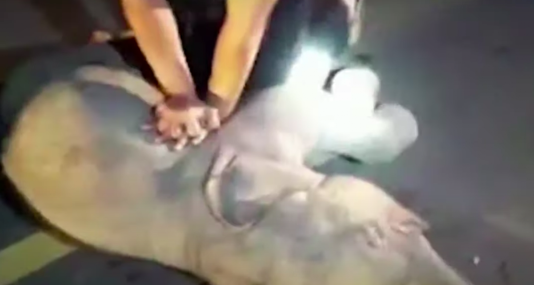 En un video que se volvió viral en las redes sociales el lunes, se ve a Mana dando compresiones a dos manos al pequeño elefante acostado de lado, mientras sus colegas a pocos metros de distancia tratan a un motociclista aturdido y herido en el piso.
